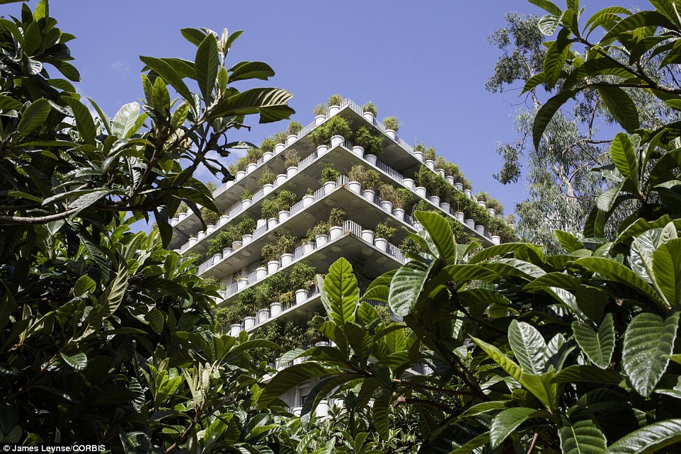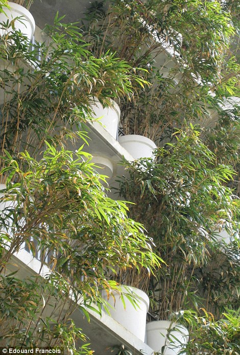 The building itself is completely hidden by the 380 plants that line each floor. The foliage is bamboo plant and a spokesperson for Flower Tower told MailOnline Travel expressed that: ‘The inhabitants enjoy the rustling of bamboo and a light filtered by the foliage. Francois aimed to give residents the impression of sleeping in a tree. He drew inspiration from the city’s inhabitants who decorate even the tiniest of balconies with plants.