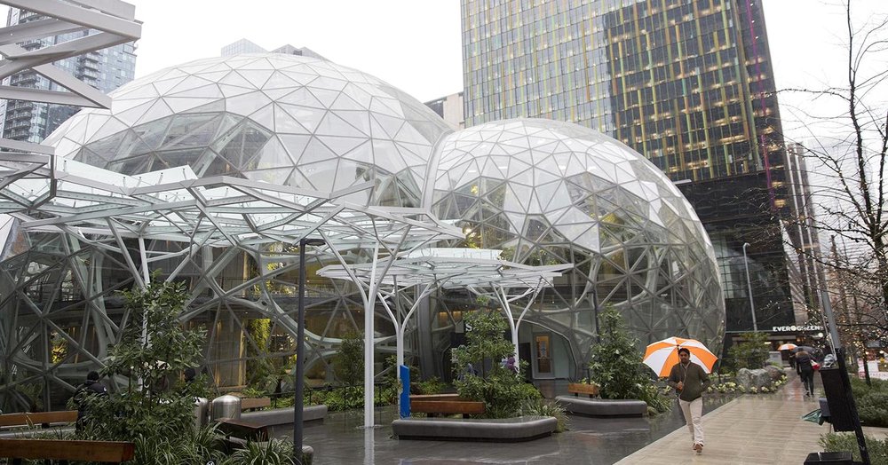 Amazon’s new pride and joy “Spheres” building consists of three dome structures, with a miniature rainforest planted inside. The rainforest houses 40,000 plants from 400 species that have been sourced from around the world. At the center of the building sits a 55-foot-tall tree nicknamed Rubi. This nature-based design was created in the hopes that it will help to spark the employees' creativity as well as offer opportunities for moments of relaxation.