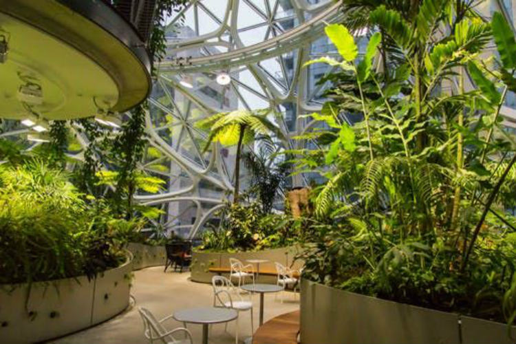 Amazon’s new pride and joy “Spheres” building consists of three dome structures, with a miniature rainforest planted inside. The rainforest houses 40,000 plants from 400 species that have been sourced from around the world. At the center of the building sits a 55-foot-tall tree nicknamed Rubi. This nature-based design was created in the hopes that it will help to spark the employees' creativity as well as offer opportunities for moments of relaxation.